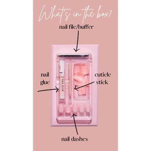 Nail Kit includes Pop-on Nail Dashes. Dual file/buffer, cuticle stick, and nail glue.