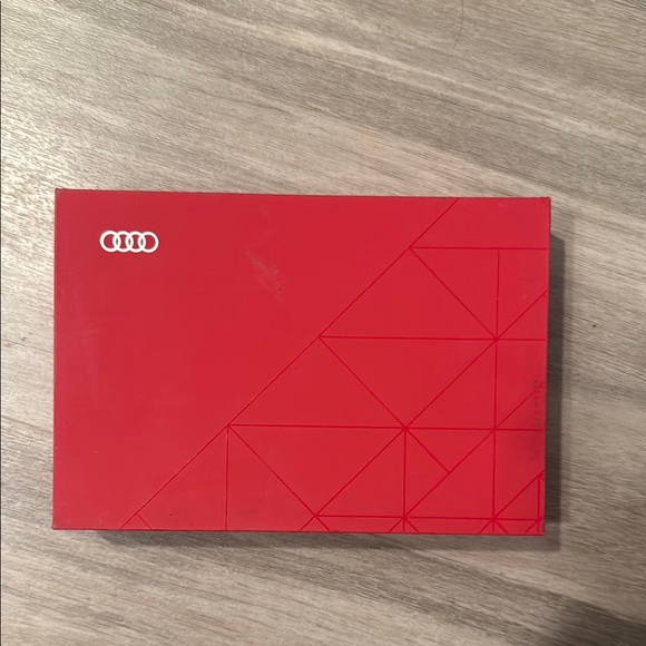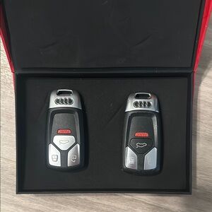 Red box with Audi logo and geometric design & two key fobs inside