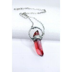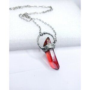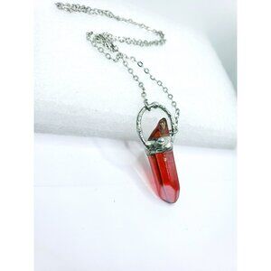 An amazing red aura quartz crystal crafted into a beautiful renaissance / medieval pendant, hung from an 18" long silver tone chain.