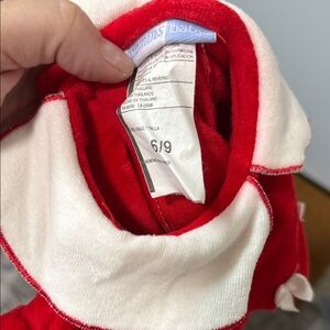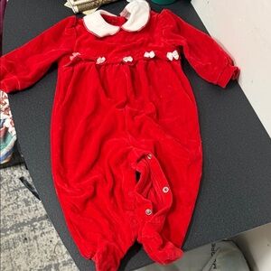 Adorable red baby romper with a white collar and cute details. Perfect for special occasions.