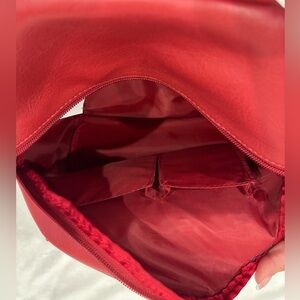 Small red backpack, perfect for everyday use. Has 2 front working zippers, clean interior/exterior, and 2 slot compartments inside backpack for storing items