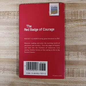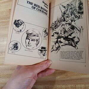 The product is a vintage 1984 black and white pocket classics comic paperback of Stephen Crane's "The Red Badge of Courage." Published by Academic Industries in the United States during the Copper Age, this illustrated fiction novel is targeted towards adult readers. The book is a collectible item that falls under the genre of classics, with elements of action, adventure, and mystery. It features works by multiple authors including Robert Louis Stevenson, making it a valuable addition to any comic book collection.