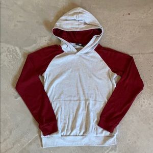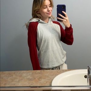 A light gray hoodie with red sleeves. Pretty lightweight, very cozy