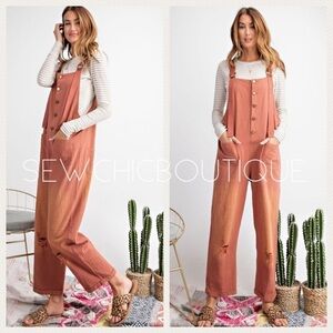 Soft Crinkly Linen button down jumpsuit with front and back pockets in “Red Bean”. This is the cutest new jumpsuit!! Adjustable straps, distressed knees, worn look on the body where the color is faded & button down front. The fabric is really soft and is 100% cotton so it’s not stretchy but it will stretch once you’re in it for a bit. The color is fab & it’s so comfy. Straight leg silhouette, Super relaxed Linen Overalls.