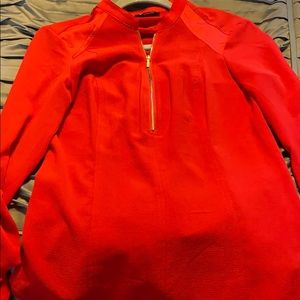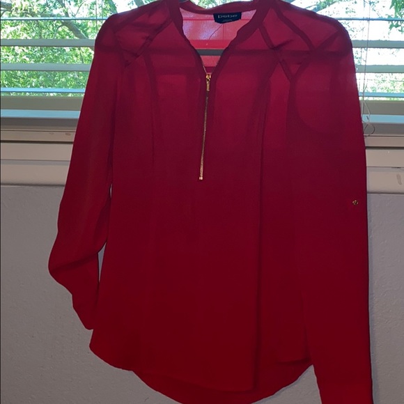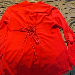 Super cute red Bebe blouse with gold zipper. Ties in the back so you can adjust tightness in waist line.