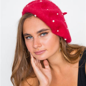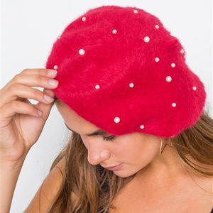 Red Beret with Real Fur and Faux pearl details