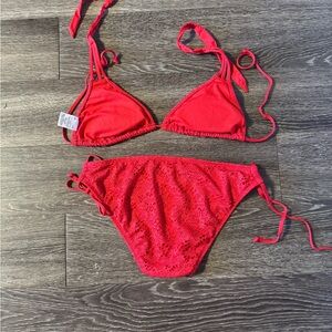 Stylish red bikini set with halter top and tie-side bottoms. Perfect for the beach.