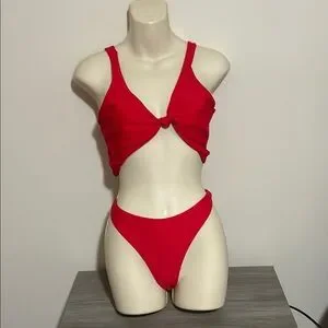 Stylish red bikini set with a knotted top and high-cut bottoms. Perfect for the beach or pool.