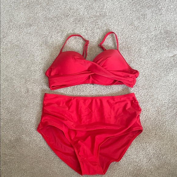 Stylish red bikini set with a twist front design. Includes a top and high-waisted bottom.