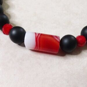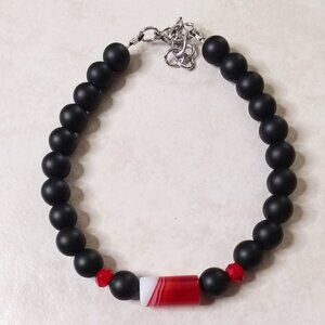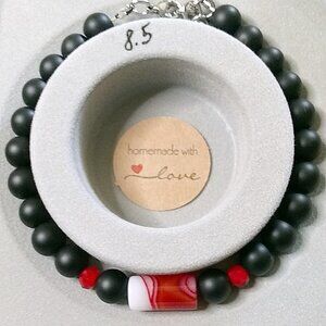 Made with black, matte finish stone beads, a red + white Agate Barrel bead and 2 blood red faceted ceramic beads. Relaxed fit an 8" wrist, or a comfortable fit for an 8.5" - with a short extender for more wiggle room... Securely closes with a lobster claw clasp!