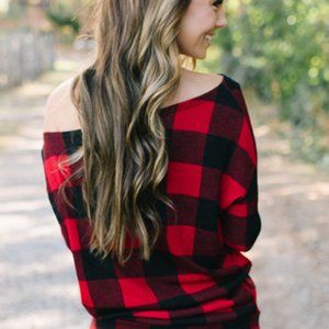 Absolutely stunning RED and BLACK Buffalo Check shirt. Can be worn off shoulder. My absolute newly favorite shirt for this season. 95% Polyester/5% Spandex. See size chart in pictures for measurements.