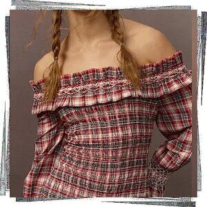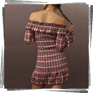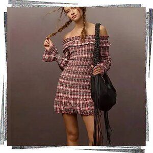 Red, black, and cream plaid smocked plaid mini dress. I wore this several times and it's in like new condition