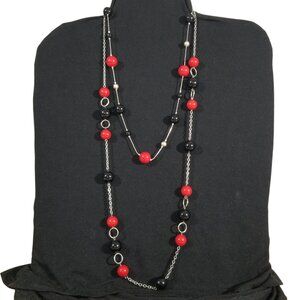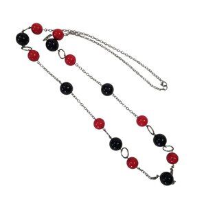 Long rope of red and black beads and silver circles and chains, claw clasp - 17" drop, 36" total