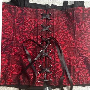 Sexy and bold red lace corset bustier with black satin paneling and lace-up back detail. Features adjustable straps, front zipper closure, and ribbon tie lacing at the back for a customizable fit. Designed with a structured silhouette for a flattering shape.