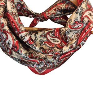 This luxurious square scarf features a striking red and black paisley design, perfect for adding an elegant, retro touch to any outfit. The lightweight silk fabric offers versatility and comfort, ideal for wearing as a stylish neck scarf, head wrap, or fashion accessory. With its boho-chic and western-inspired pattern, this scarf complements a variety of looks, from casual wear to formal ensembles. Measuring 23 inches square, it is generously sized for creative styling options, making it a must-have addition to any wardrobe.
