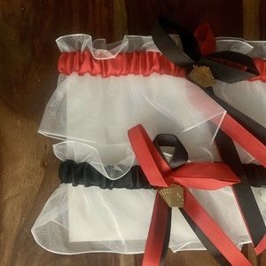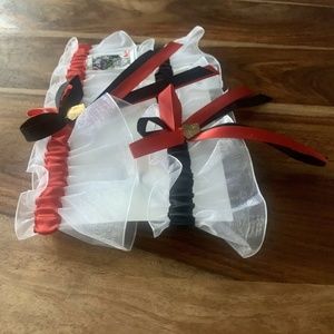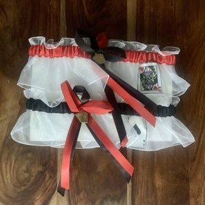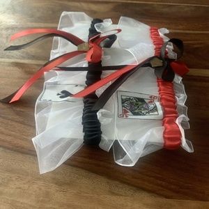 Red Black Satin Las Vegas Queen Ace Card Gold Charm Mesh Stretch Garter Band Set
