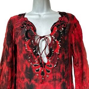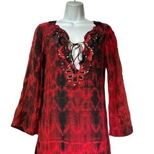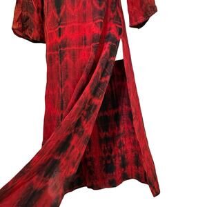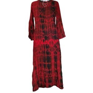 Red Black Silk Beaded Sequin Tie Dye Boho Maxi Dress Long Sleeve Dark gothic M