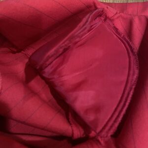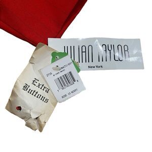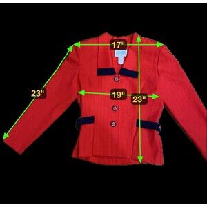 This vintage red blazer jacket for women in size 10 is a classic piece made in the USA by Julian Taylor. The mid-length jacket features a solid pattern with a navy pin stripe accent, button closure, and long sleeves. Suitable for casual, business, church occasions in the spring, winter and fall seasons, the breathable polyester blazer has a retro 80s and 90s theme. Perfect for those looking for a fitted red blazer with a pop of navy color. It is a dark navy that appears black to me, but tags say navy and tomato red.