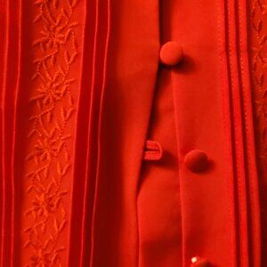 Unique red blouse with buttons. Very light material. 100% polyester. Color is a Red not orange. Blouse is short sleeve and hits a little past the waist. Size 16 by Ship'N Shore.