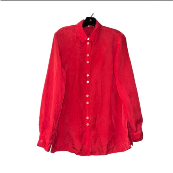 Soft muted red blouse with contrasting pearl-like buttons.