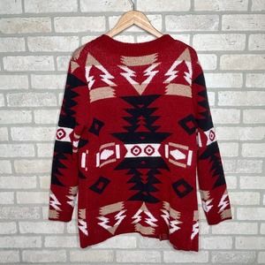 Red, blue, tan and white Aztec design knit cardigan. 2 front deep pockets. Super comfy!