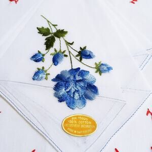 Red/ Blue Floral Embroidered 2 Handkerchiefs Cottagecore Hankie Switzerland NOS