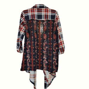 Red & Blue Plaid Open-Front Duster Cardigan With Floral Back Panel Size 1X