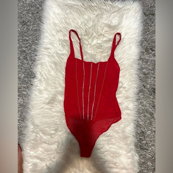 This vibrant red bodysuit is a must-have for your wardrobe. The sheer mesh fabric and delicate rhinestone detailing add a touch of glamour, while the classic bodysuit silhouette offers a versatile and flattering fit. Perfect for layering or wearing as a statement piece, this bodysuit will elevate any outfit.