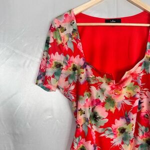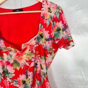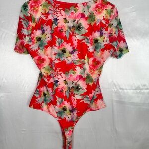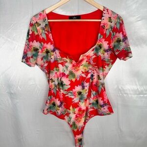 This fitted bodysuit features a vibrant red base adorned with a floral print in pink, white, and green. The asymmetrical neckline and short sleeves add a modern touch to this stylish top, perfect for warm weather.