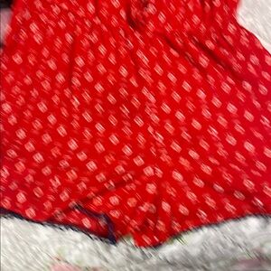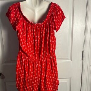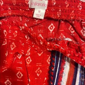 Chic red bohemian dress with short sleeves and a drawstring waist. Features a colorful striped accent on the front.