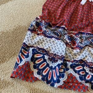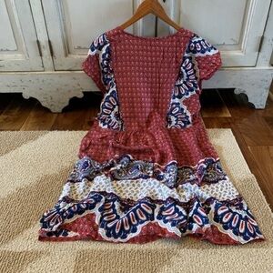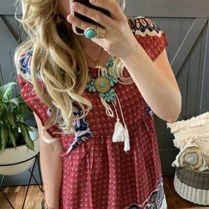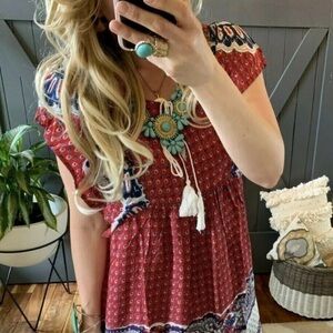 Beautiful Boutique Bohemian Tassel Tunic Summer Dress. This boutique dress features a red print base and darling ivory tassels that tie up at the neck area. The dress hits right at the knee for most. Cotton Blend, soft & silky and lightweight.
