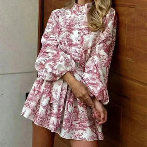 Red Boho Women's Elegant Random Print Long Sleeve Tie-Waist Loose Fit Midi Dress