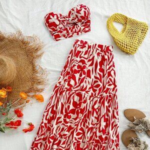 Red Boho Women's Holiday Floral Printed Strapless Skirt And Crop Top