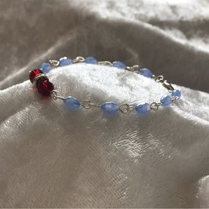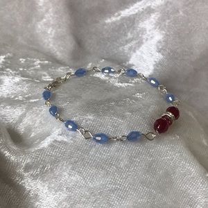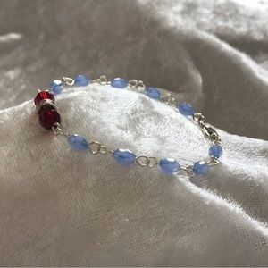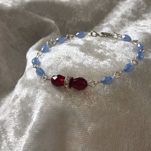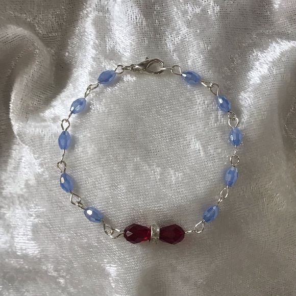 ✨Faceted red Swarovski teardrop crystal beads, silver-plated rhinestone rondelle bead, faceted periwinkle AB oval glass beads, silver-plated lobster claw clasp.