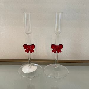 Red Bow Glass Taper Candle Holders 7in Set of 2 Holiday Glam