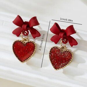 Elegant and stylish earrings featuring a red bow design with glittery heart pendants, suitable for adding a touch of charm to your look.