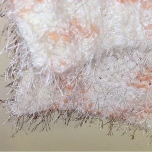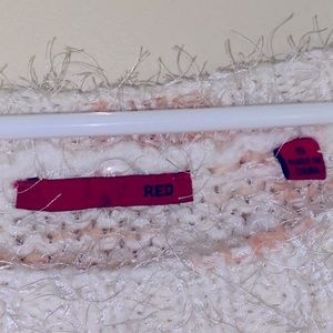 Red Brand Long Sleeve Ballet Pink & White Scoop-neck Fuzzy Sweater. Size Small. Made of Acrylic and Polyester. It’s super soft and plush. Color is a white/off white with peach/Ballet Pink details (see pics). Side slits. It comes up a little higher in the front. Chest at the widest point is 18-1/2” flat. Length is 25-1/2”. Sleeve length is 20-1/2” from armpit.