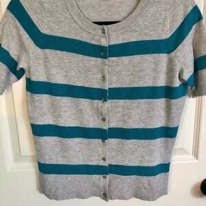 Red brand short sleeve button down cardigan. Gray w/ teal stripes, can be worn open or closed. Nice and soft!