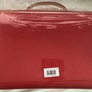 Modern red briefcase made in Italy, by San Lorenzo. Features frosted handle, shoulder strap, and turn clasp closure. No exterior or interior pockets.