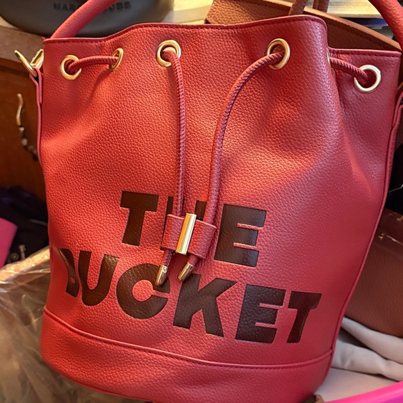 Stylish red bucket-style drawstring handbag with bold lettering. Smooth pebbled exterior and gold-tone hardware for a polished look. Compact and versatile for everyday wear. Red color adds a vibrant pop to any outfit.