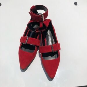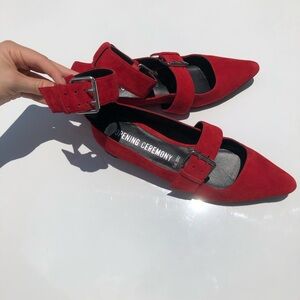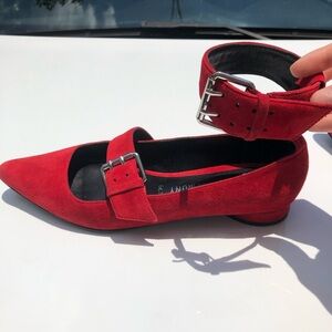 Gorgeous red suede buckle flats in amazing condition. Size 8.5. Look like MiuMiu or Ganni buckle flats; super trendy.