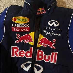 Stylish Red Bull Racing jacket with vibrant logos. Features a mix of red, blue, and black colors.