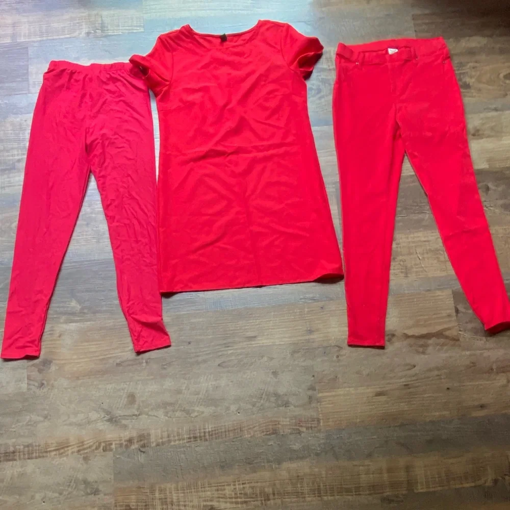 Vibrant red pieces for a ketchup costume. Dress is a polyester t-shirt dress. Leggings are off Amazon, one size, I’m a size 4-6. Jogging an are from Walmart. All pieces worn once.