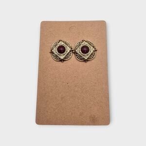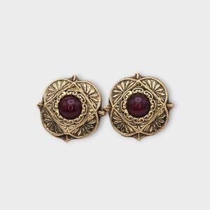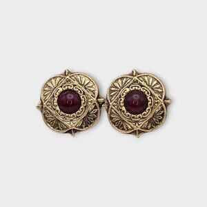 Red Burgundy Gold Victorian Style Vintage Earrings – 1928 Brand Jewelry – Filigree Post Earrings – Antique Revival Medallion Design