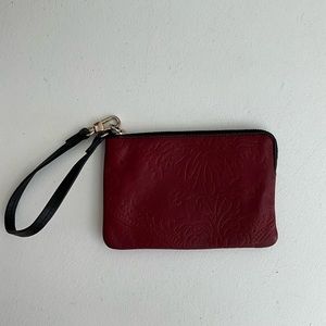 Red Leather Mini Bag Zipper Pouch Wristlet Clutch Leaf and Paisley