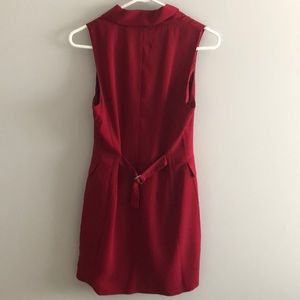 Open front red dress. Button up. Four buttons on front, two can be undone. Collared v-neck. Fake pockets. Adjustable waist in back. Sleeveless.