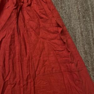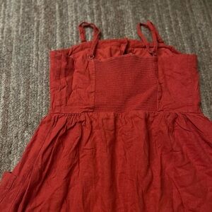 Chic red sundress with button-down front. Perfect for casual outings. With side pockets and adjustable straps
