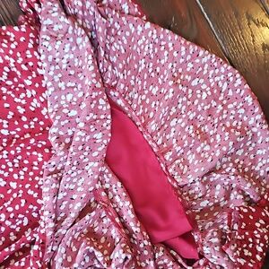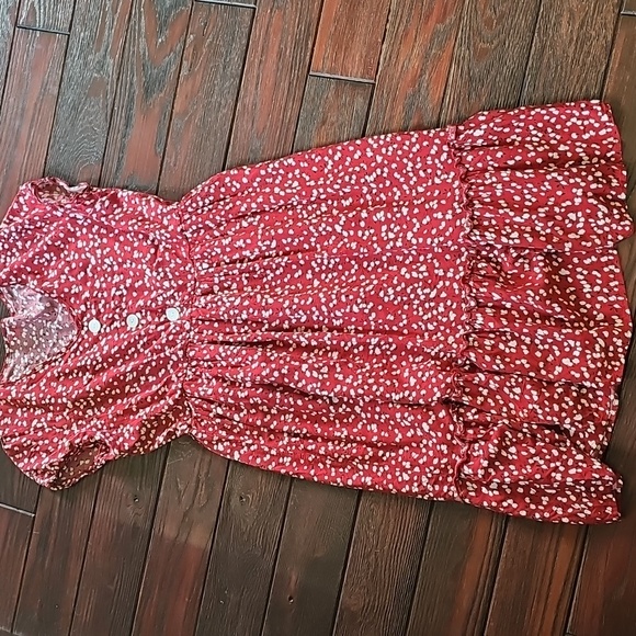 Stylish red dress with white patterns. Features a button-front design. cap sleeves and ruffle hem. lined skirt.