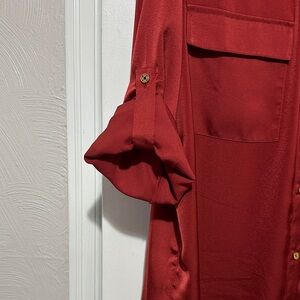 Elegant red button-up blouse with front pockets. Perfect for any occasion. Nice option for sleeves to be rolled or left long.