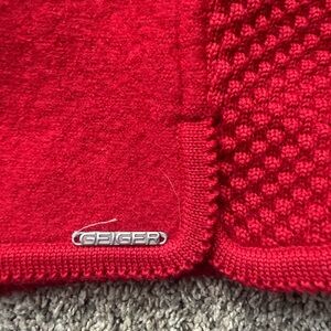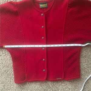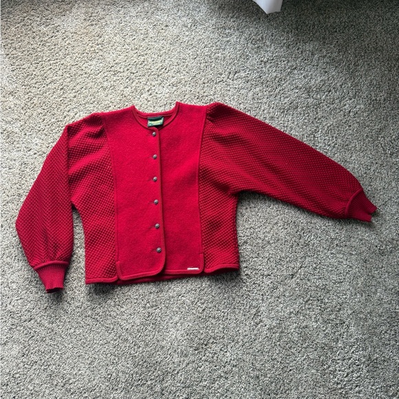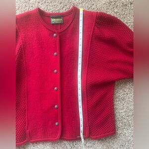 red button-up cardigan with textured sleeves. Vintage beauty. Gorgeous buttons. Made in Austria! Very pretty ballooned sleeves. Unique piece. European size 36. Fits womens M. Length is 21 and 1/4 inch. Pit to pit is 20”
